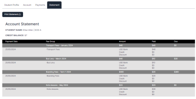 - Instant Student Account Statements: Foster trust and transparency with parents by providing detailed and readily available student account statements.